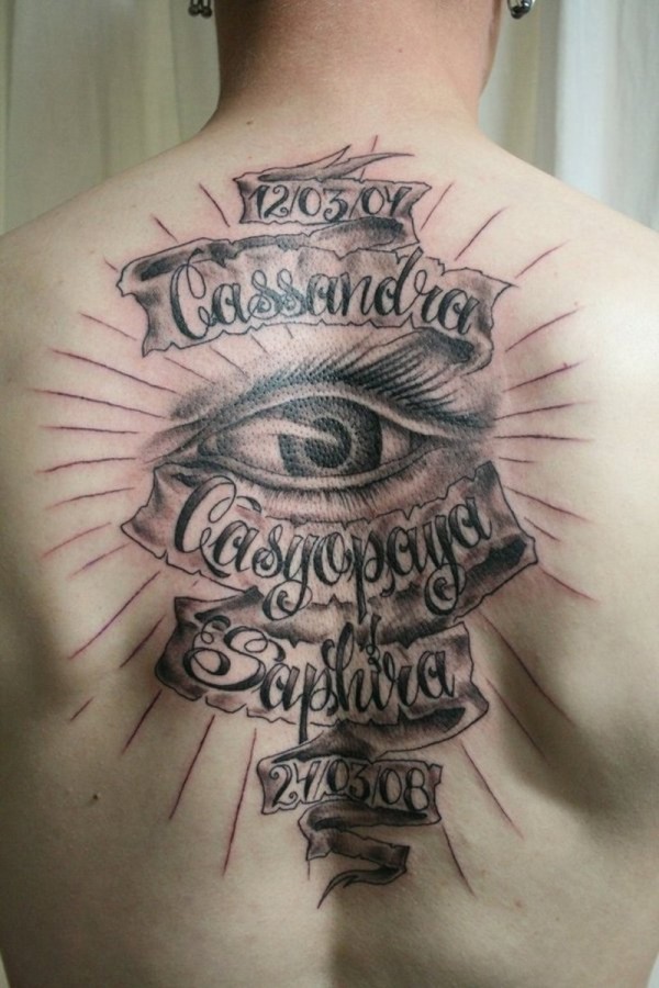背部黑白纪念字母眼睛纹身图案