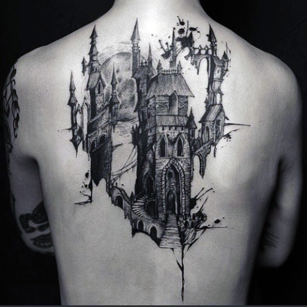 背部黑白幻想城堡纹身图案