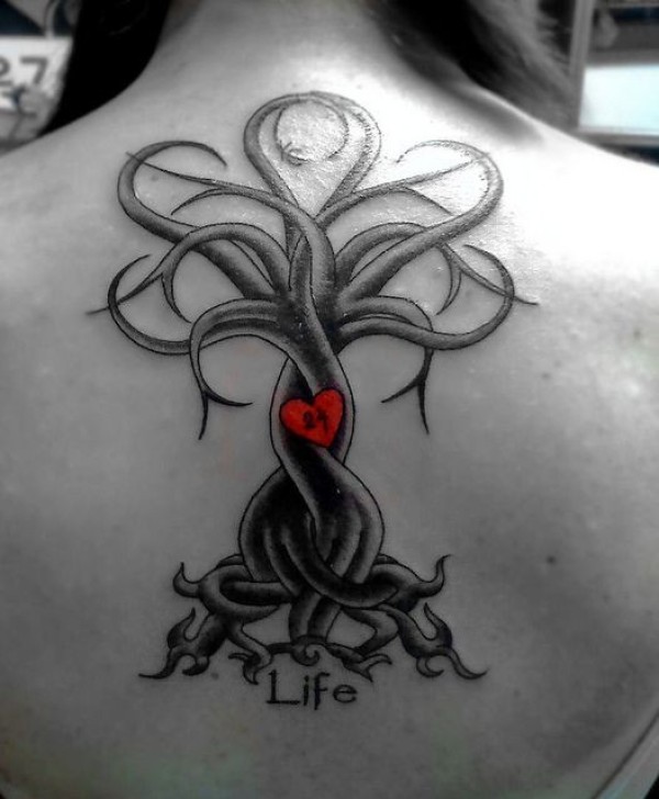 背部红色的心形和字母大树纹身图案