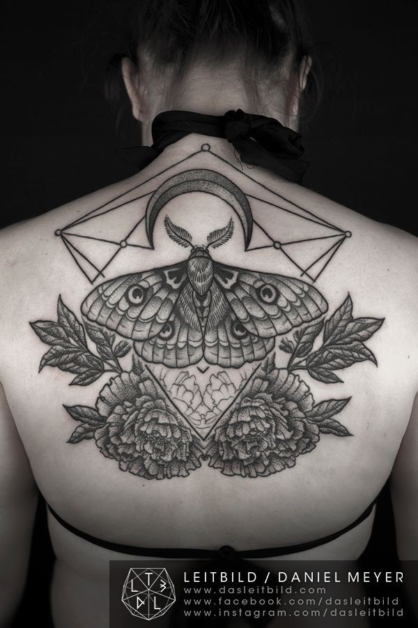 背部神秘风格黑白蝴蝶花朵纹身图案