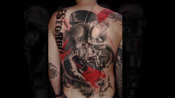 背部彩色的字母与防毒面具纹身图案