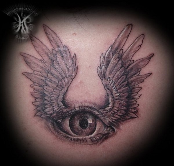 背部写实的黑色眼睛和白色的翅膀纹身图案