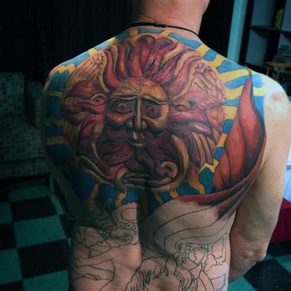 背部原始部落风格彩色大太阳纹身图案