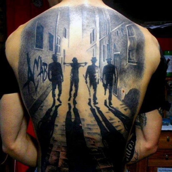 背部很酷的黑白暴徒与夜间城市纹身图案
