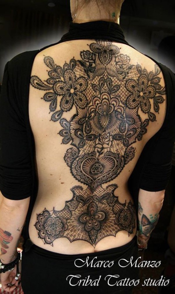 背部惊人的大面积花卉装饰纹身图案