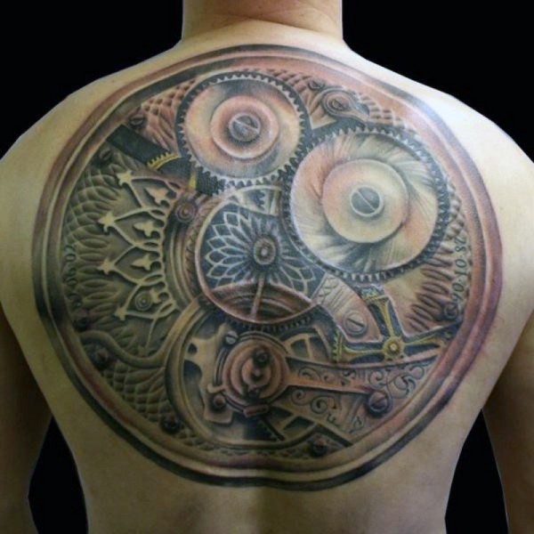 背部精美细节的机械纹身图案