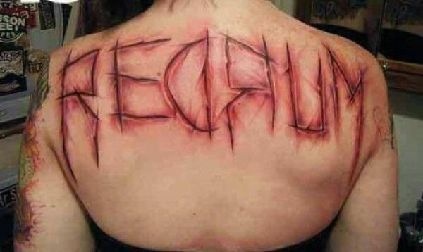背部令人毛骨悚然的血腥割肉字母纹身图案