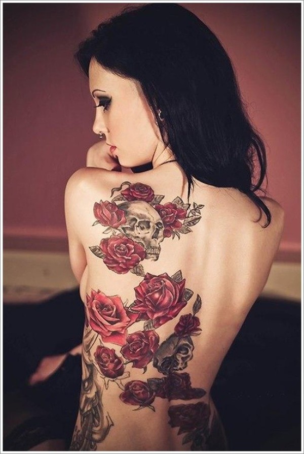 美女背部好看的红玫瑰骷髅纹身图案