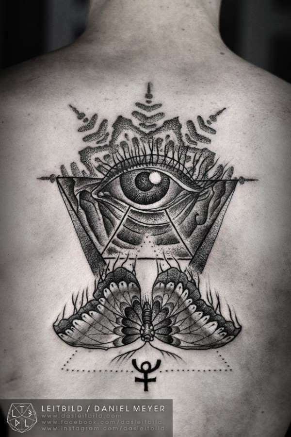 背部黑白点刺神秘眼睛与蝴蝶几何纹身图案