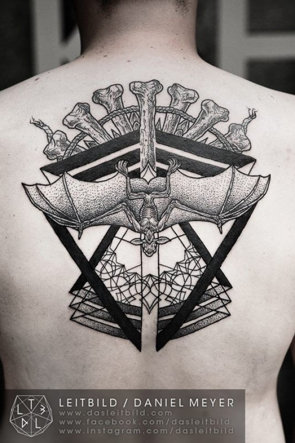 背部点刺部落风格黑白几何与蝙蝠纹身图案