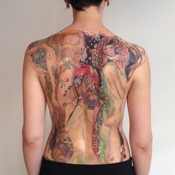 背部美丽的彩色裸体女人纹身图案