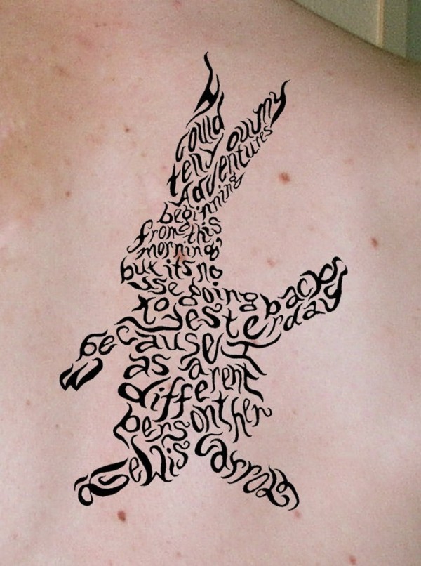 背部黑色字母组成的兔子纹身图案
