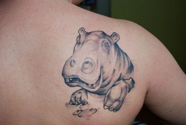 微笑的灰色河马头像背部纹身图案