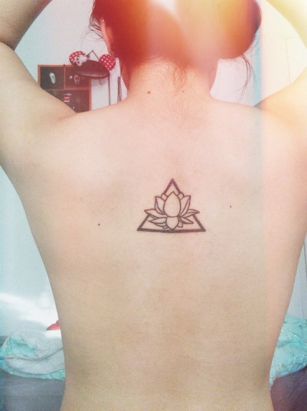 背部简单的黑色莲花与三角形纹身图案