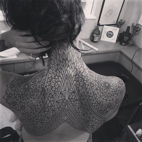 背部和肩膀精彩的黑色线条装饰纹身图案