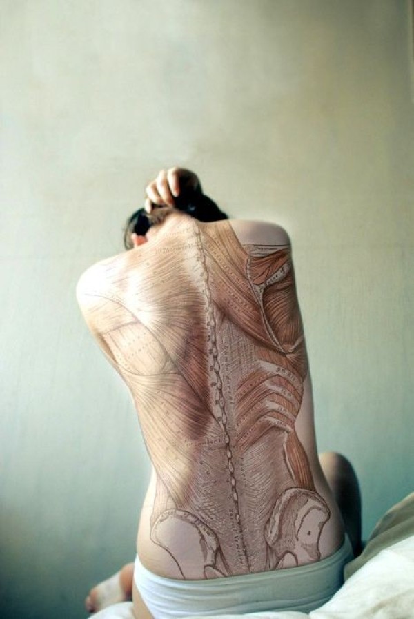 背部惊人的写实彩色背部肌肉与骨骼纹身图案