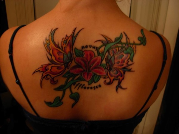 背部有趣的五颜六色花卉蝴蝶纹身图案