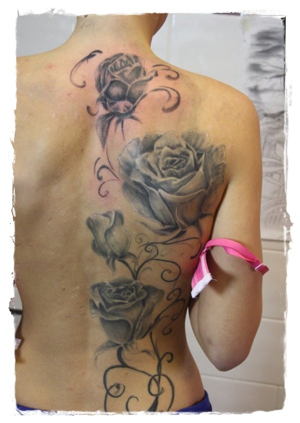背部美丽的黑白玫瑰藤蔓写实纹身图案