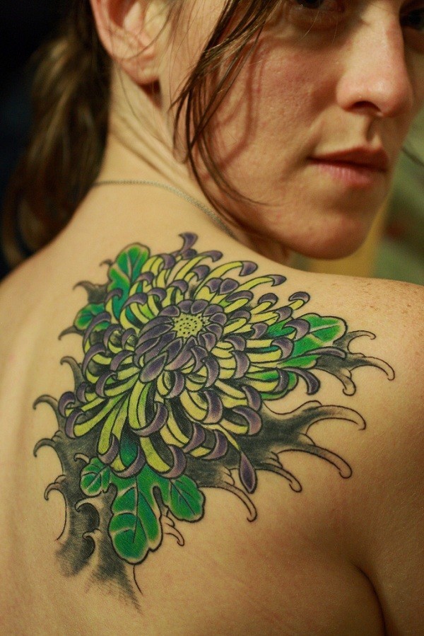 背部漂亮的绿色和黑色菊花纹身图案