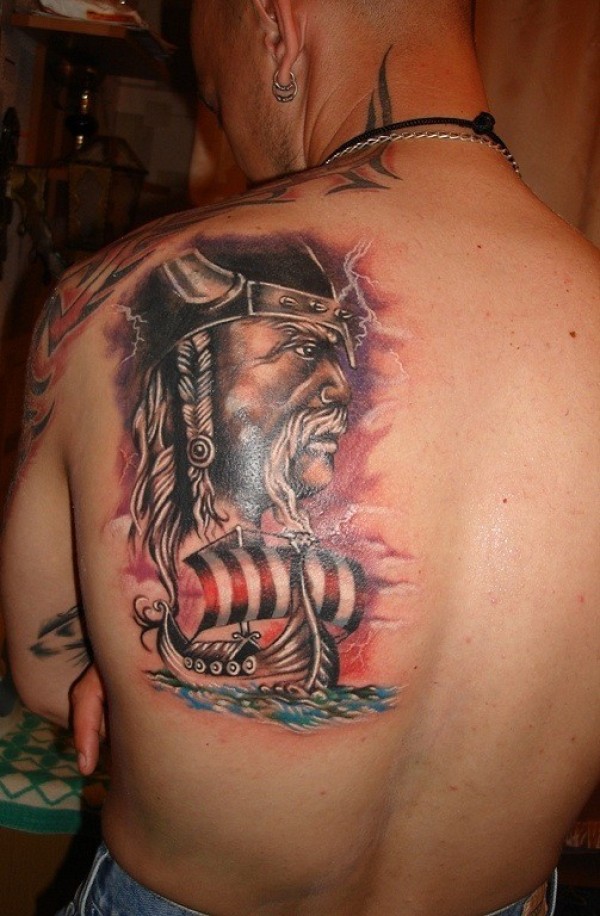 维京战士和帆船彩绘纹身图案