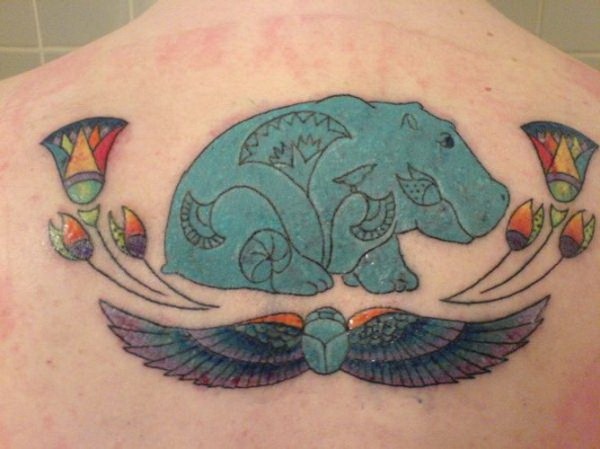 背部有趣的蓝色河马花朵和翅膀纹身图案