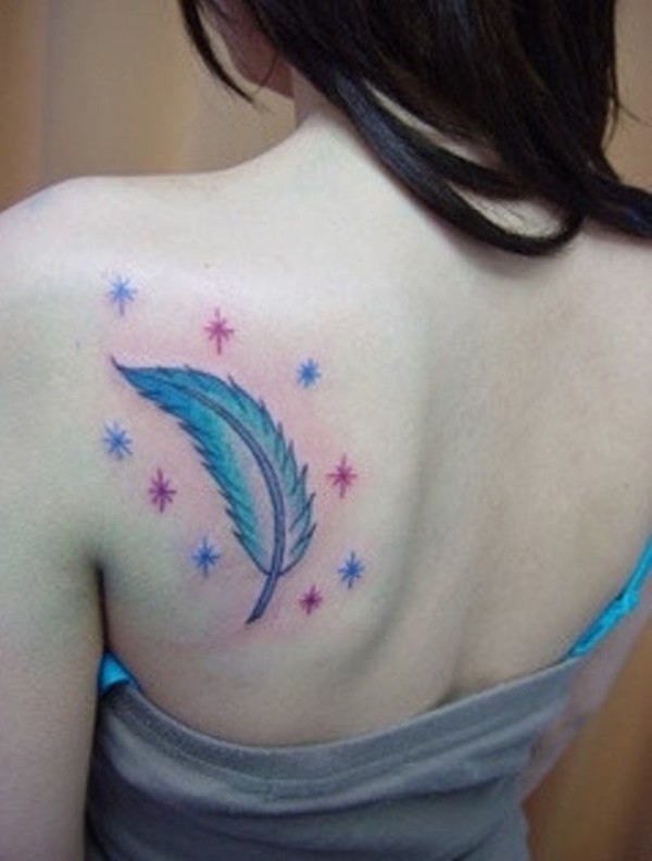 女孩背部可爱的蓝色羽毛星星纹身图案