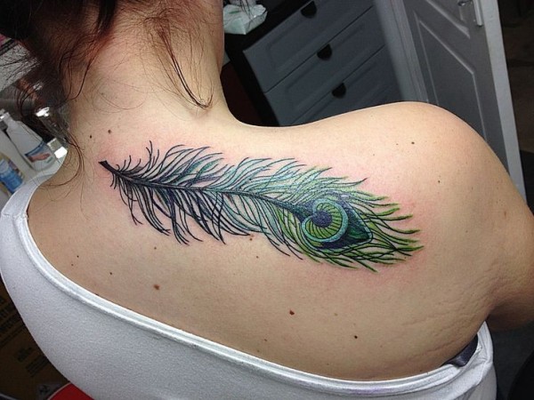 背部美丽的绿色孔雀羽毛纹身图案