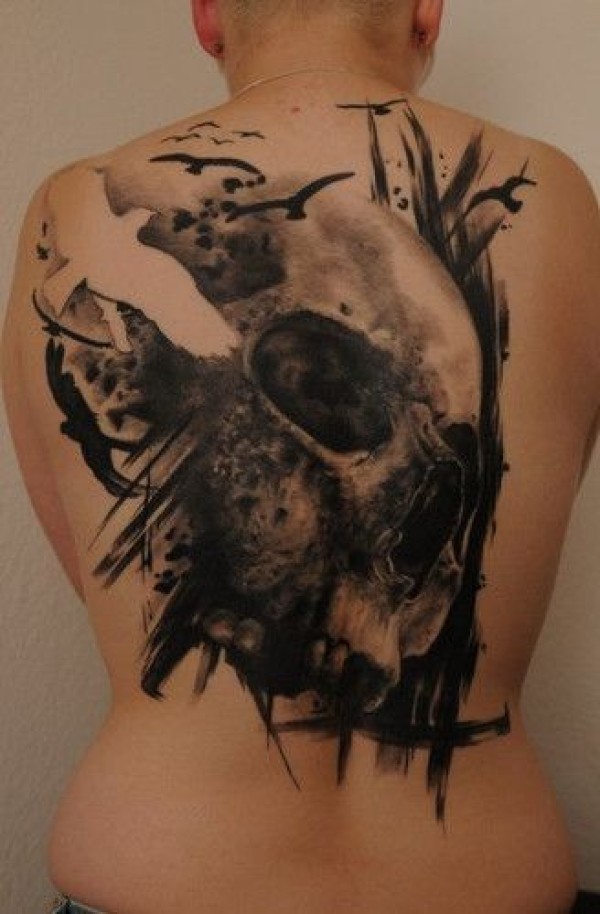 背部优雅的黑灰色骷髅和白色的鸟纹身图案