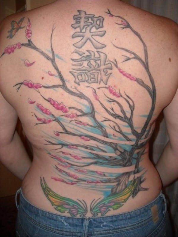背部中国风汉字花朵树纹身图案