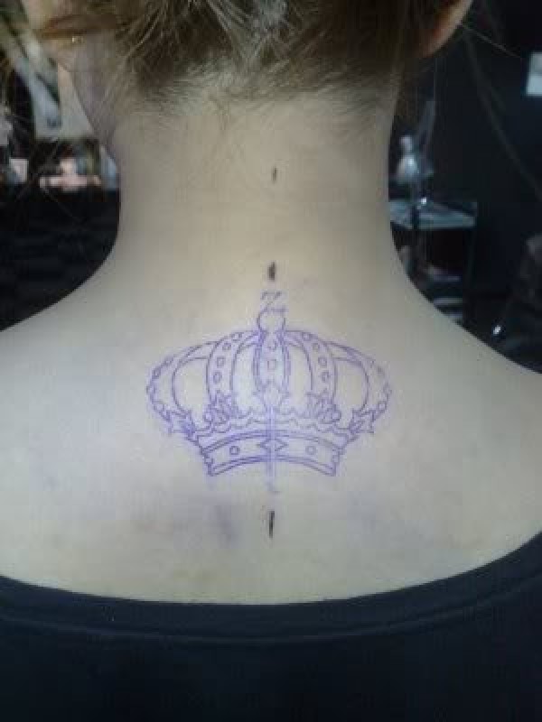 女生背部紫色的皇冠纹身图案
