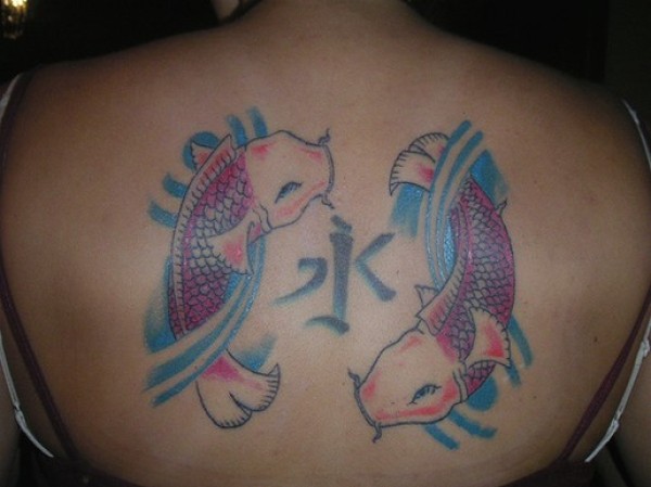 背部中国风鲤鱼和汉字彩绘纹身图案