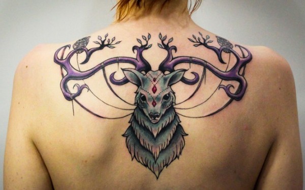 背上的彩色鹿头纹身图案