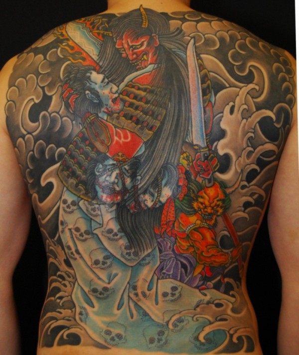 满背的日本武士战斗彩绘纹身图案