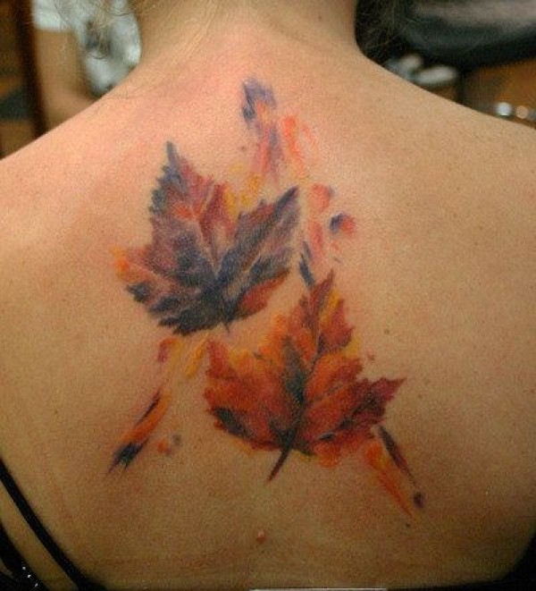 写实的彩绘枫叶背部纹身图案