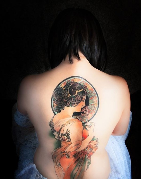 背部漂亮的女人肖像彩绘纹身图案