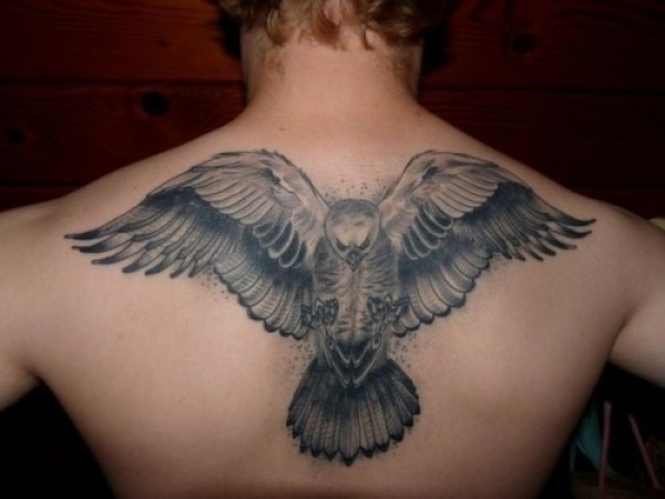 背部黑灰色的大鹰纹身图案