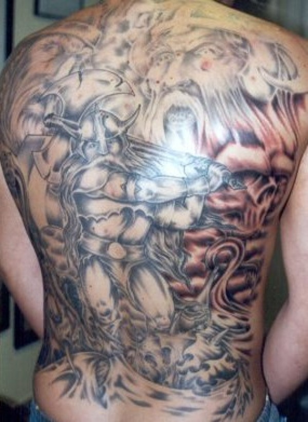 背部斯堪的纳维亚神和海盗斧头纹身图案