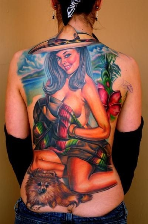 背部彩绘海滩性感女郎与小狗纹身图案