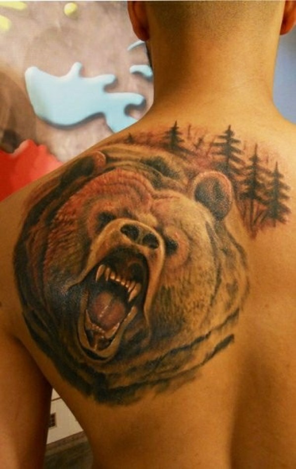背部一头咆哮的熊纹身图案