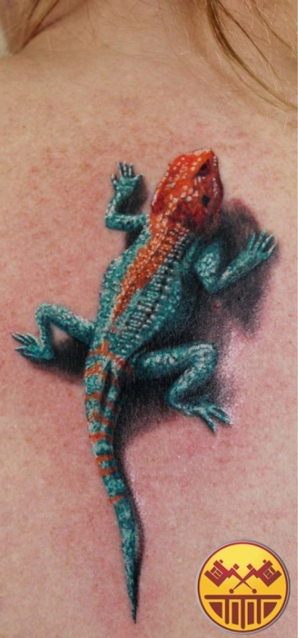 背部超逼真的写实蜥蜴彩绘纹身图案