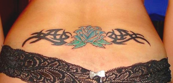 背部黑色部落图腾与蓝色花卉纹身图案