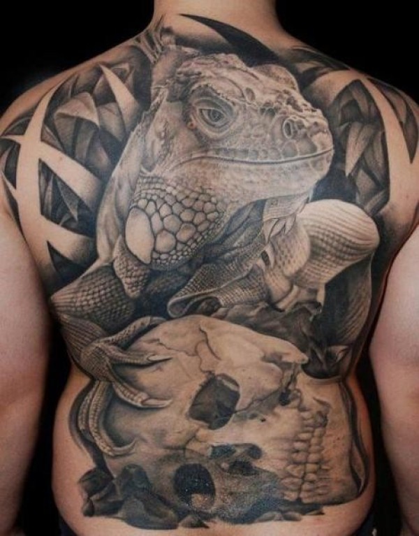 背部写实的蜥蜴骷髅纹身图案
