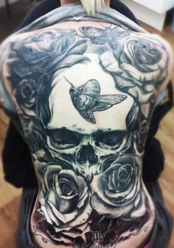 满背黑白骷髅与蝴蝶和玫瑰纹身图案