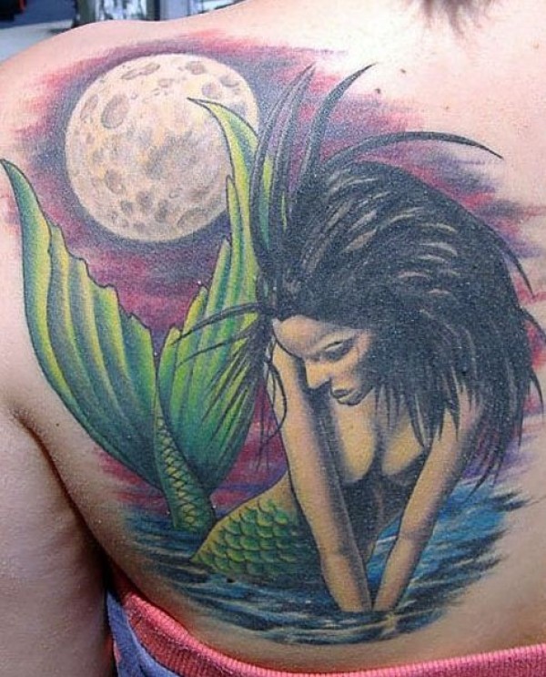 背部彩色的美人鱼和满月纹身图案