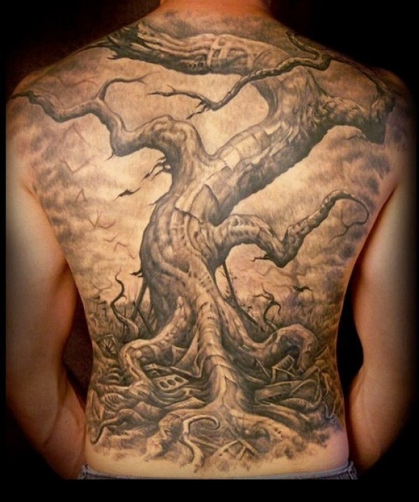 背部伟大的写实枯树纹身图案