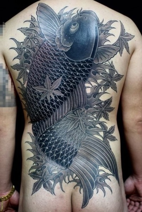 男性背部日本锦鲤鱼和枫叶纹身图案