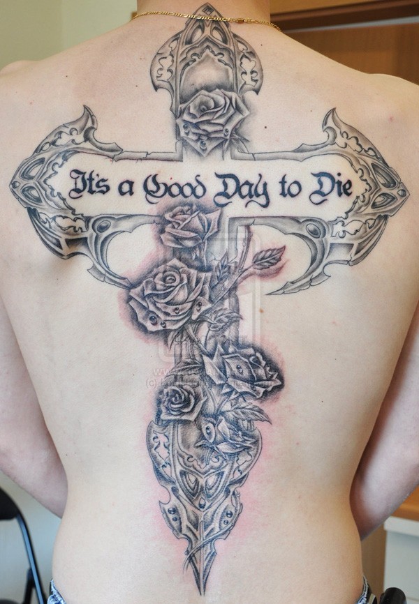 背部美丽的十字架与玫瑰纹身图案