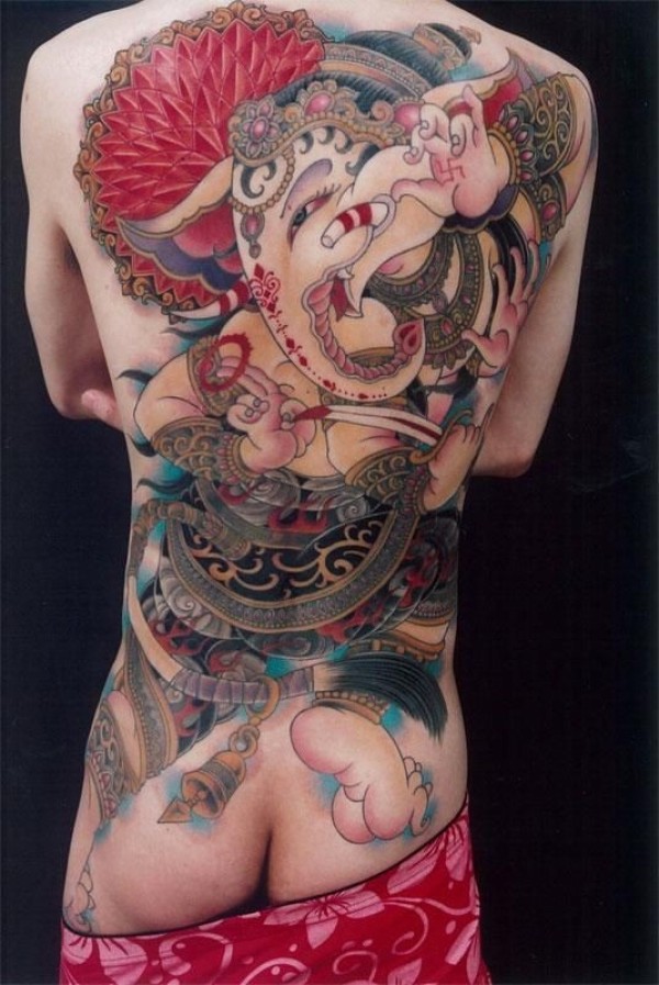 满背美丽的印度甘尼萨象神纹身图案