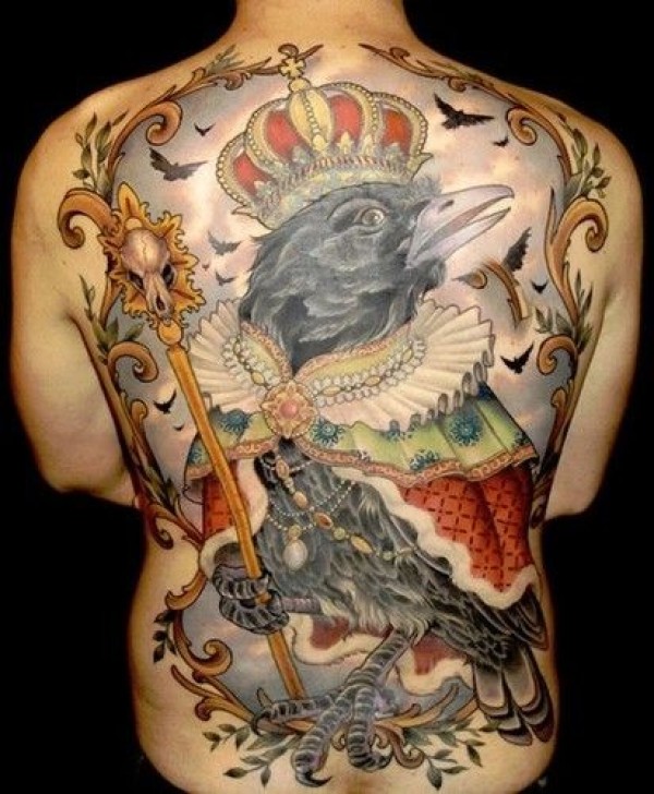 背部彩色大乌鸦和皇冠权杖纹身图案