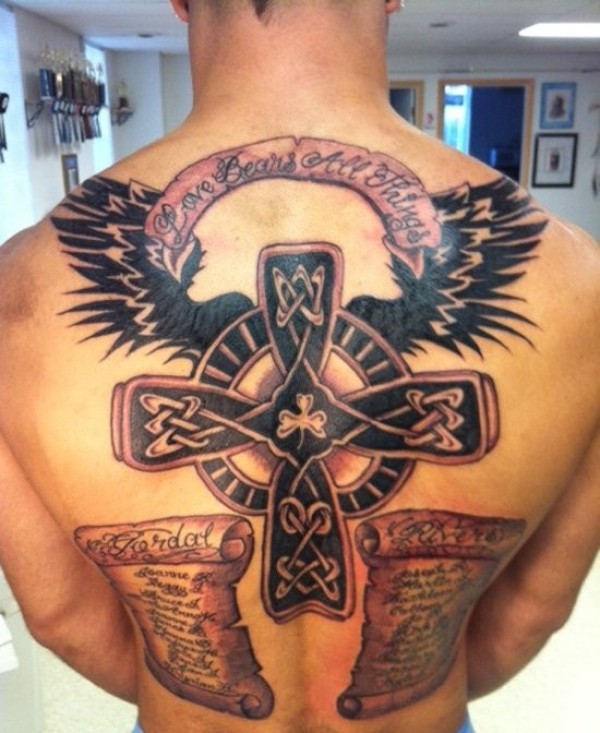 背部凯尔特风格翅膀十字架和铭文纹身图案
